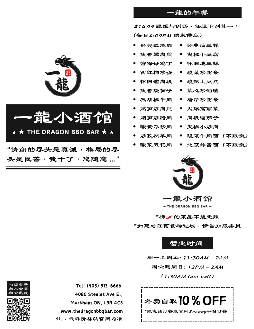 Welcome to The Dragon BBQ Bar 一龍小酒馆, the ultimate destination in Markham for an authentic Chinese BBQ experience that combines flavor, atmosphere, and community. Nestled conveniently at 4080 Steeles Ave E Unit 3 - 5A, this lively restaurant operates daily from noon till 2 AM, making it the perfect spot for late-night cravings or weekend feasts with friends and family.